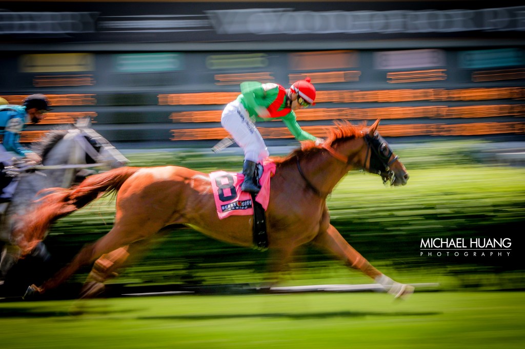 And here’s one I took of the exciting finish of the Oaks, with Irad Ortiz, Jr congratulating his mentor John Velazquez after a hard fought battle down the stretch. You can see Mike in the background pushing the remote triggers.