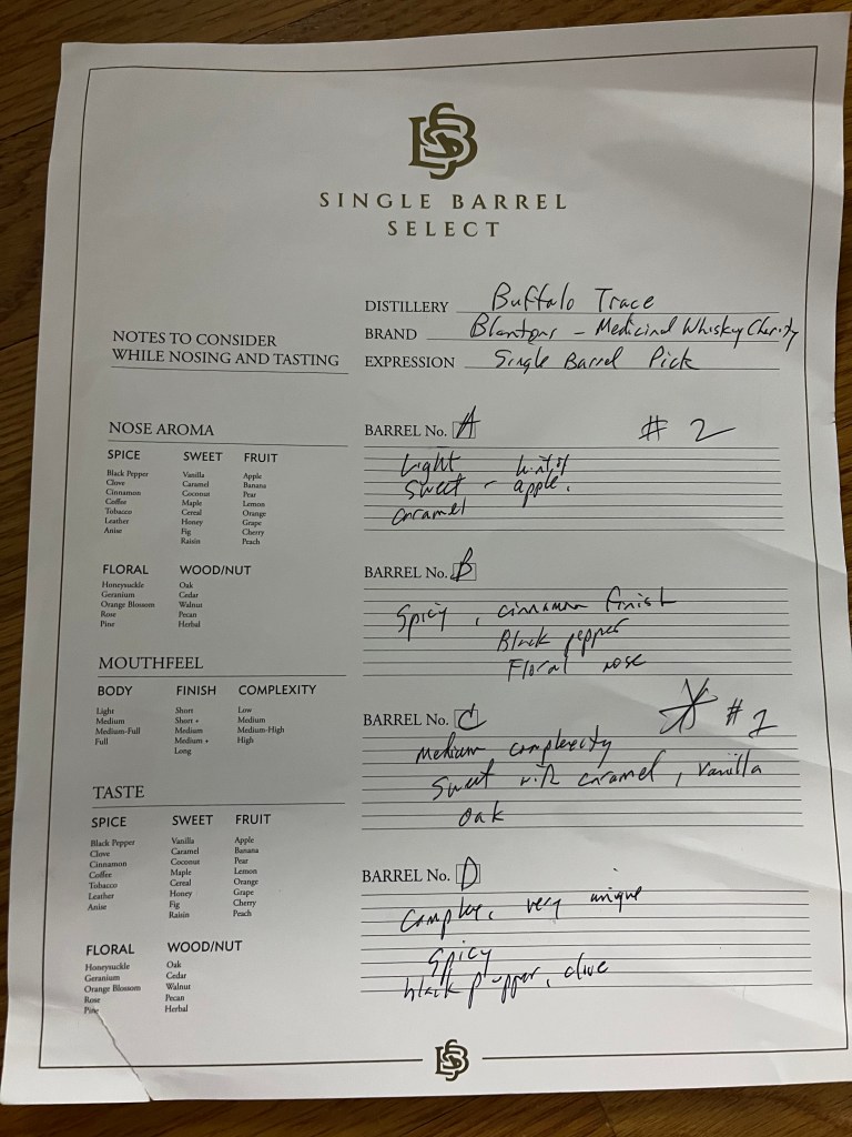 As awesome as walking through the rickhouse where all the barrels of Blanton’s on earth are stored, the fun was just beginning, and our barrel selection associate Lance led us through the tasting and selection process. We had 4 barrels to taste, which were diluted to 93 proof so we would be judging on what would eventually go in the bottles.