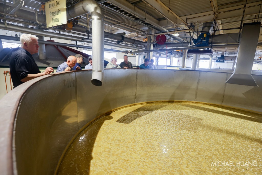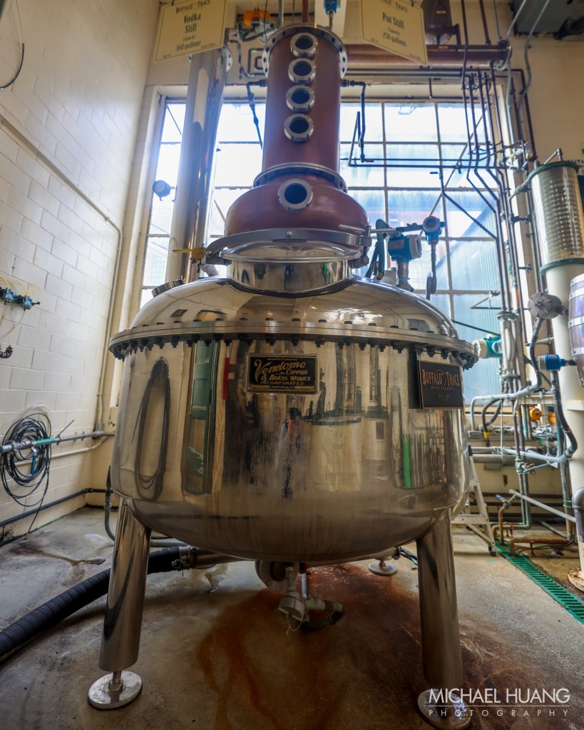 Jimmy led us around, basically showing us the process of producing bourbon at Buffalo Trace. We learned and witnessed how corn (bourbon has to be at least 51% corn) and grains like rye, wheat and barley are cooked with Kentucky limestone-rich water, then fermented over several days in large vats with yeast. The fermented liquid is then distilled, meaning it is heated and evaporated, and the vapor is collected as it recondenses into a liquid. The process is repeated to remove impurities and raise the alcohol content. To be considered bourbon the distillate cannot come off the still at higher than 160 proof (80% alcohol) and cannot be put in the barrel at more than 125 proof. It has to be aged for at least 2 years in new charred oak barrels without coloring or additives. Blanton’s is aged 6-8 years and bottled at 93 proof.