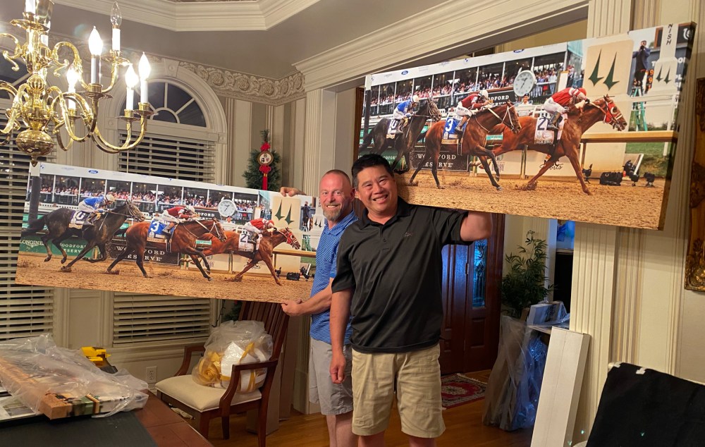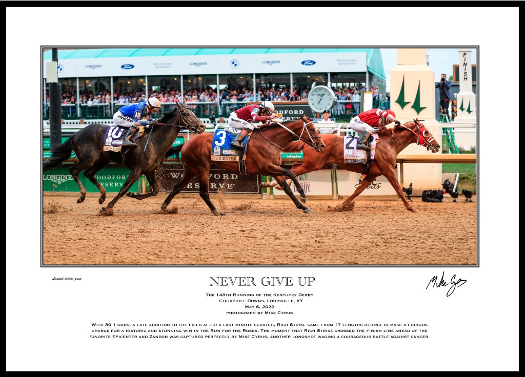 “Never Give Up” is an 18×24 inch fine art print on acid free 100% cotton textured heavy 300 g archival paper featuring Mike’s flawless finish line photograph of Rich Strike’s stunning victory in the 2022 Kentucky Derby. No more than 300 will be produced. If you are interested in purchasing this beautiful limited edition artwork for a minimum donation of $130, please send an email to heartofbbn@gmail.com for details.