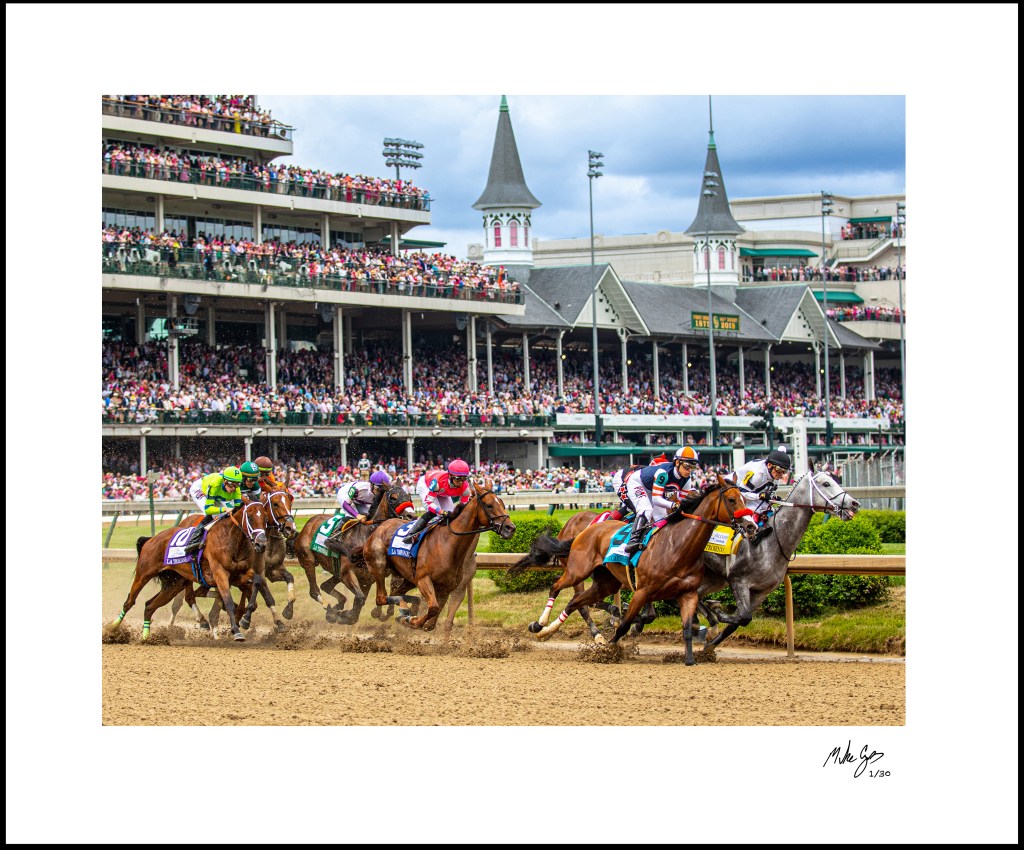 The second special limited edition print for sale is a 12×16 inch photograph packaged with a 16×20 inch mat personally signed by Mike on the day before he passed. “Chase Your Dreams” is a beautiful shot of the horses rounding the turn on Kentucky Oaks Day 2019 with the iconic twin spires in the background. Of all the photos he took in his life, it was Mike’s favorite image, the one of which he was most proud to display. He signed 30 of these, and they are the last 30 prints that will bear his actual handwritten signature. Since there are only 30 of these, we are asking for a minimum donation of $200 for each of these. Once again, email me at heartofbbn@gmail.com to order or get more information.